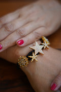 Cadmium-free brass. 18k gold plating. Engineered, custom-cut stones and/or pearls.